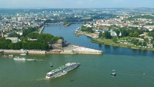 ▲德意志角:又稱德國之角,是位于德國科布倫茨市摩澤爾河和萊茵河交匯處的一塊陸地。德意志之角上最著名的建筑是威廉一世的騎馬雕塑,雕塑總高37米,其中騎士像高14米。