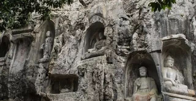 ▲飛來峰造像:中國五代至元代時期的佛教石刻造像。位于浙江杭州靈隱寺前的飛來峰上,有造像380余身。最早的造像為后周廣順元年(951)滕紹宗所造的彌陀三尊像。