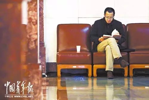 在北京人民大會堂開幕前,俞敏洪在角落里閱讀