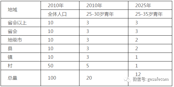 假設(shè)在2010年時總共有20個25-35歲青年,他們的城鎮(zhèn)化率已達(dá)到75%,20人中只有5人還常住在村里,常住在省會及以上的為30%。