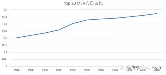 從1930年到1960年,在美國300多個“地級市”中,居住在top 20“地級市”的人口比重,從23.6%提升到了32.8%。