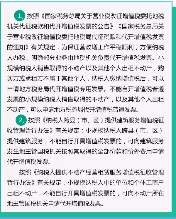 為配合營改增相關政策制度的執(zhí)行,在原有發(fā)票管理制度基礎上,稅務機關代開發(fā)票的規(guī)定相應發(fā)生了較大的變化。主要有以下幾個方面